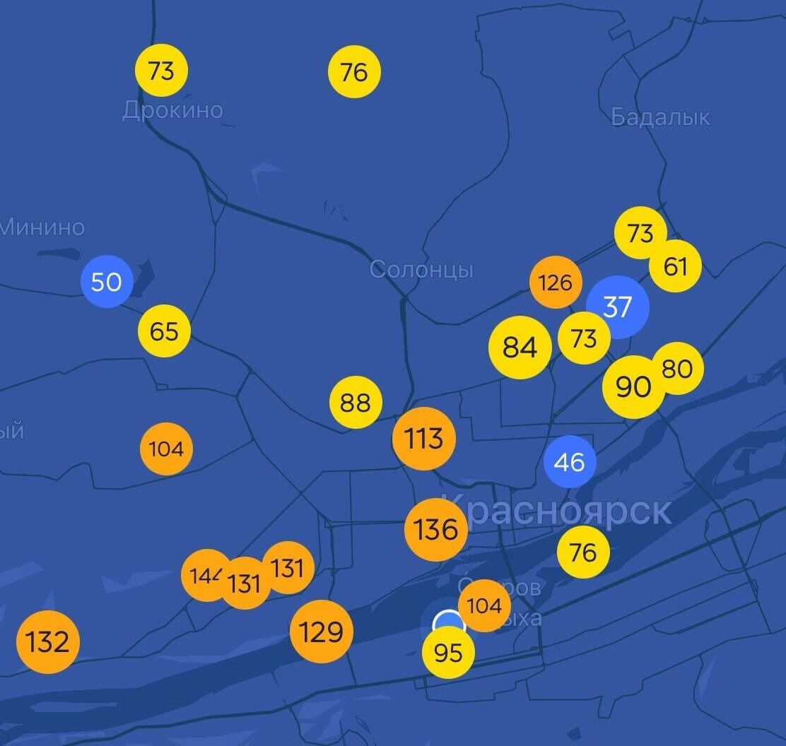 Судя по датчикам проекта Nebo.Live, сейчас хуже всего в Красноярске дышится в Железнодорожном районе, Академгородке, в Тихих Зорях и на улице Петра Подзолкова. Там датчики горят красным и оранжевым цветами.