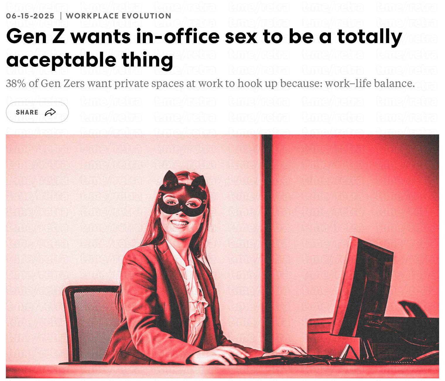 Согласно новому опросу, значительная часть современного поколения хочет, чтобы романтические и сексуальные отношения на рабочем месте стали нормой, считая это частью здорового баланса между работой и личной жизнью.