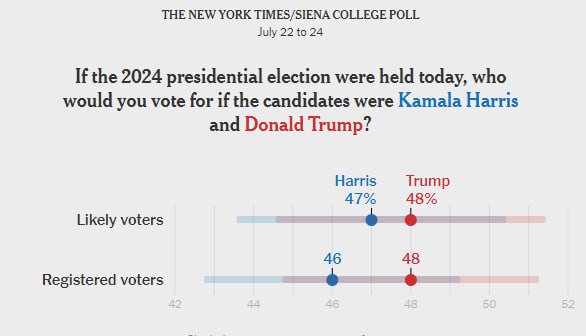 📝 Согласно данным опроса газеты New York Times и исследовательского института Siena College, за вице-президента США готовы проголосовать 47% избирателей, а за ее оппонента – 48%.