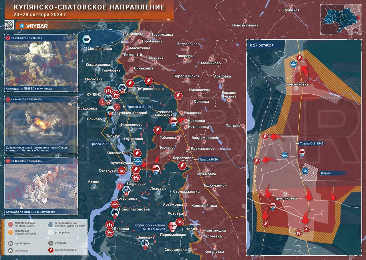 Российские войска освободили большую часть Кругляковки, приблизившись к переправе через Оскол. Бои в селе идут в районе русла реки и перекрестка дорог Р-79 и О-211942. Севернее российские войска выбили противника с окраин Колесниковки и предпринимают попытки пройти вдоль железнодорожных путей и зайти в лесной массив к западу.