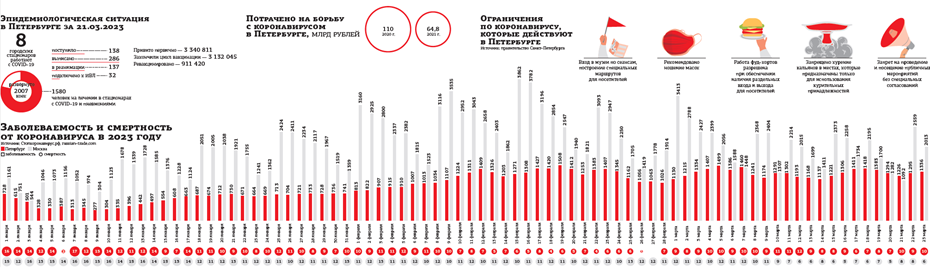 В городском комитете по здравоохранению обращают внимание на то, что Петербург и Москва всегда находились в лидерах по числу заболевших, а также госпитализируемых и умерших. Это связано с высокой плотностью населения и развитой системой общественного транспорта. Поэтому в данных на "Стопкоронавирус.рф" в какой–то промежуток времени может быть впереди Москва, а потом Петербург, и наоборот. Сравнение с другими регионами в комитете считают некорректным.