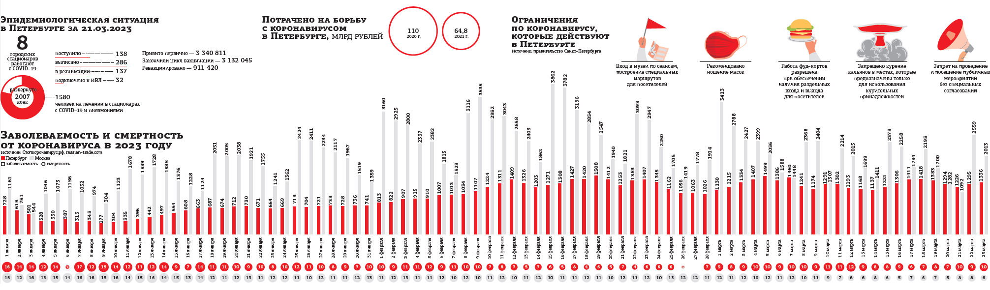COVID–19 в Петербурге официально объявлен рядовым сезонным заболеванием. Спустя 3 года он перестал пугать и врачей, и бизнес, и власти. Несмотря на несколько свежих рекордов по заболеваемости и смертности, введения новых ограничений никто не ждёт и меры безопасности ужесточать не собирается.