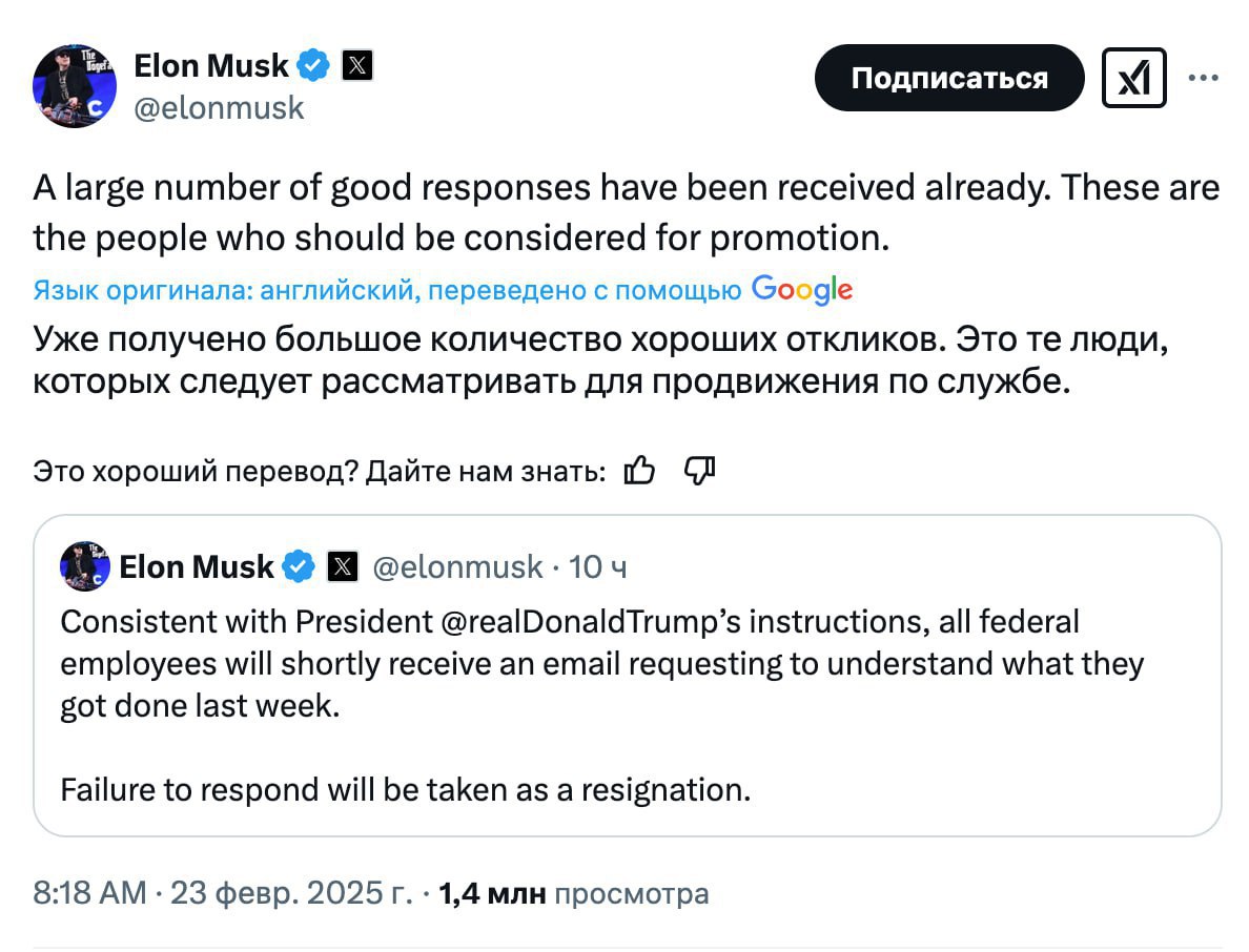 Ранее он сообщил, что всем федеральным служащим в США пришлют электронное письмо с просьбой отчитаться. За отсутствие ответа пригрозил увольнением.