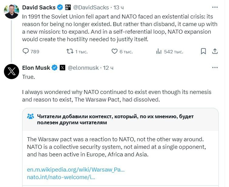 Так бизнесмен ответил на пост инвестора Дэвида Сакса, что, расширяясь, НАТО сама создаёт угрозу ради оправдания собственного существования.