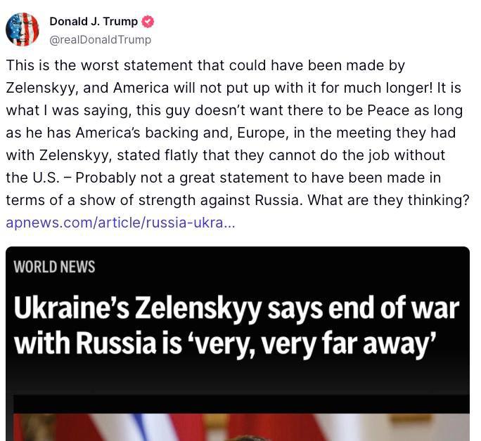 🇺🇸 Трамп назвал слова Зеленского, что до окончания войны в Украине еще очень далеко, худшим заявлением, с которым США больше не будут мириться