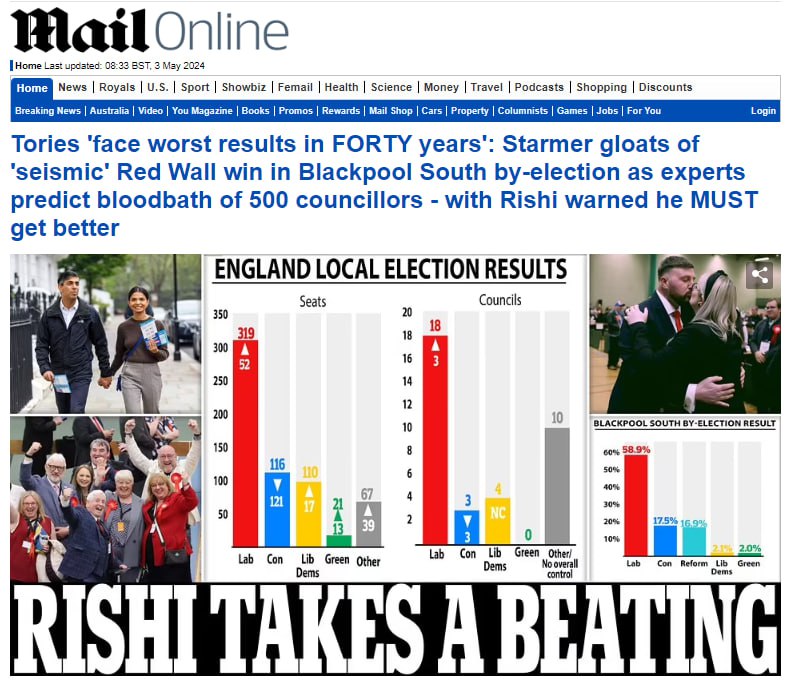 "Риши терпит поражение" — свежая передовица в самой популярной британской газете Daily Mail. На местных выборах Консервативная партия столкнулась с худшими результатами за сорок лет. Среди прочего, лейбористы впервые отобрали у неё район Рашмур — "дом британской армии". Всё предвещает эпический провал консерваторов на всеобщих выборах, которые должны состояться не позднее 28 января 2025 года.