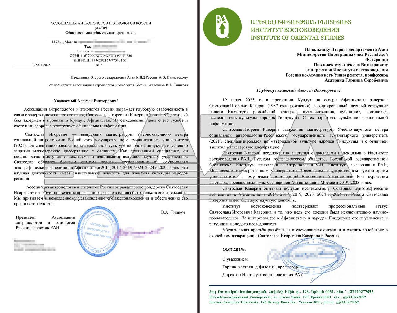 «До сих пор не удалось добиться ни его (Каверина. — Прим. "Базы") встречи с представителями России в Афганистане, ни официальной информации от афганского правительства о причинах его задержания. Мы очень обеспокоены судьбой нашего друга и коллеги, яркого и бескорыстного российского исследователя, и просим Вас оказать всё возможное содействие в обеспечении С. И. Каверину консульской поддержки, в том числе его непосредственной встречи с российским консулом в г. Кабуле», — говорится в одном из писем.
