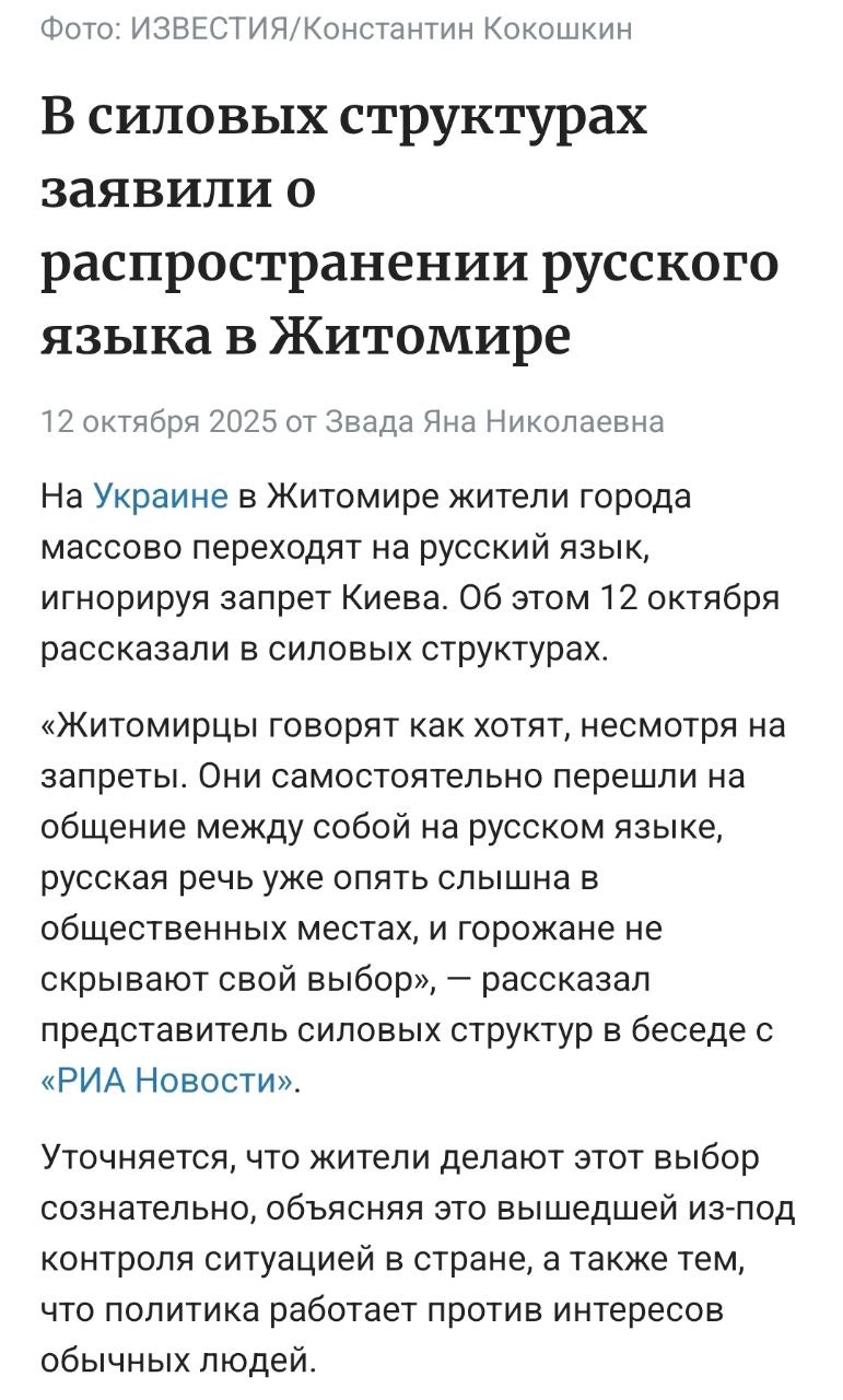 Смешная новость в ленте попалась. Известия (ИЗВЕСТИЯ!!!) радостно сообщают о том, что в Житомире распространяется русский язык. Мне сложно было подобрать комментарий, чтоб российская аудитория оценила прикол. Мало того, русскоязычные в Житомире были обнаружены благодаря аналитической работе российских siloviki. Также из этого делаются далеко идущие выводы. Правда, боюсь, что после этой публикации русский язык в Житомире запретят, да и сами житомирцы будут его использовать в обиходе меньше, чтоб ни дай Бог ... ну вы поняли.