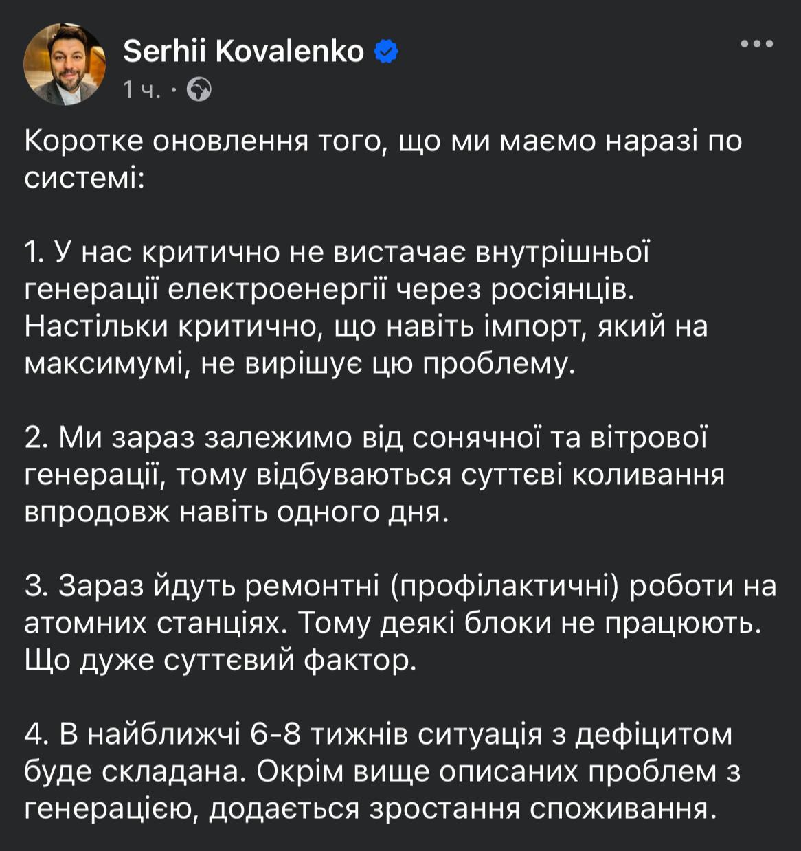 🔌 Для Украины следующие 6-8 недель будут еще сложнее, — гендиректор Yasno Коваленко