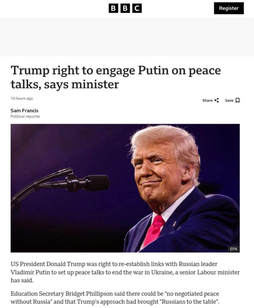 По её мнению «невозможно достичь мира путем переговоров без России», и подход Трампа привел «русских за стол переговоров». @banksta