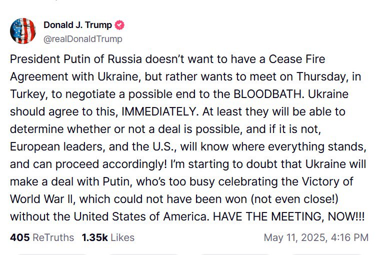 Трамп приказал Зеленскому "немедленно встречаться с Путиным в четверг". Никакого упоминания ультиматума, никаких угроз в адрес России.