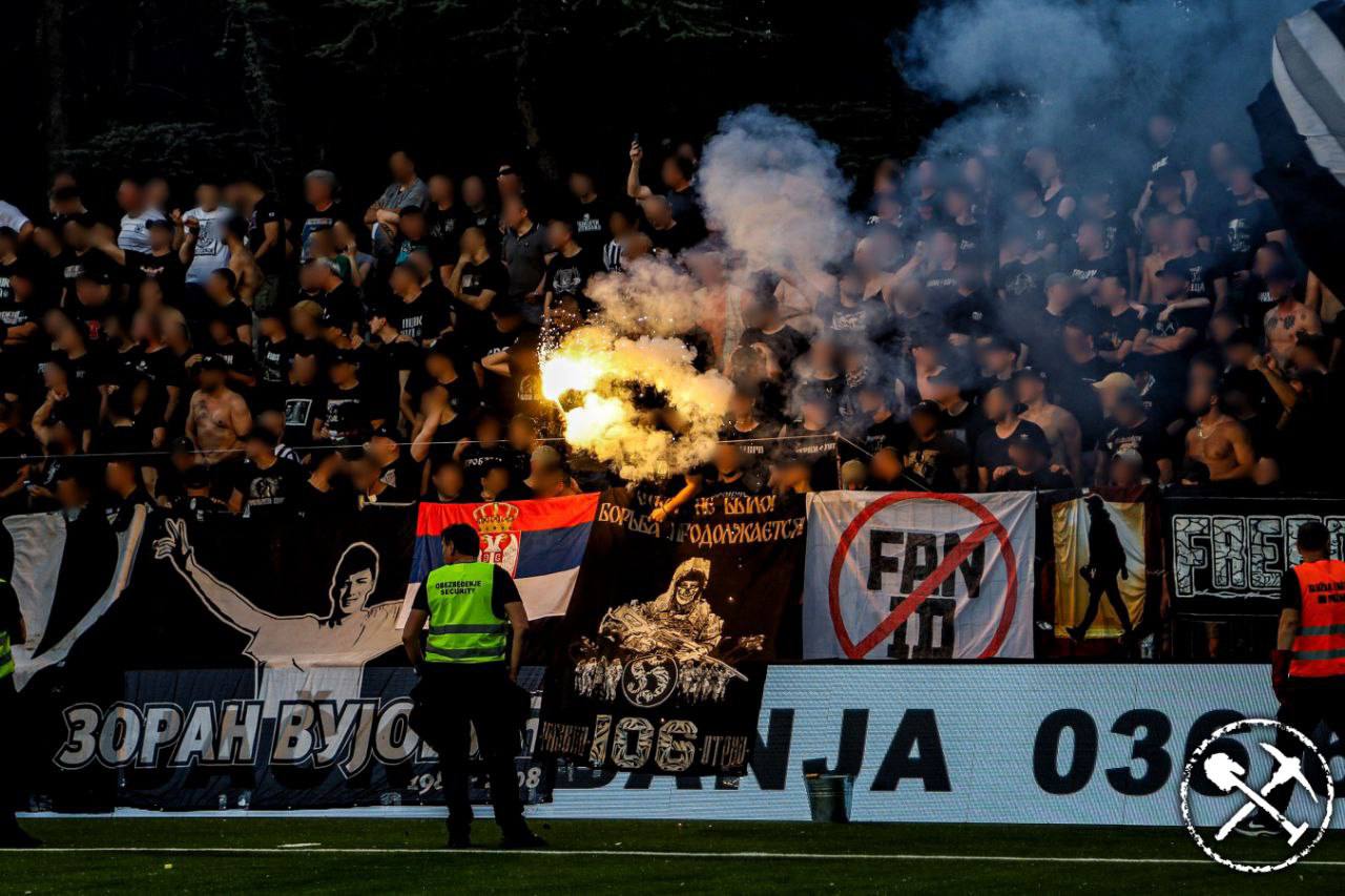 Баннер отряда 106 "Светлояр", состоящего из русских националистов и футбольных фанатов 🇷🇺 на трибуне фанатов белградского "Партизана" Гробарей на выездном матче.