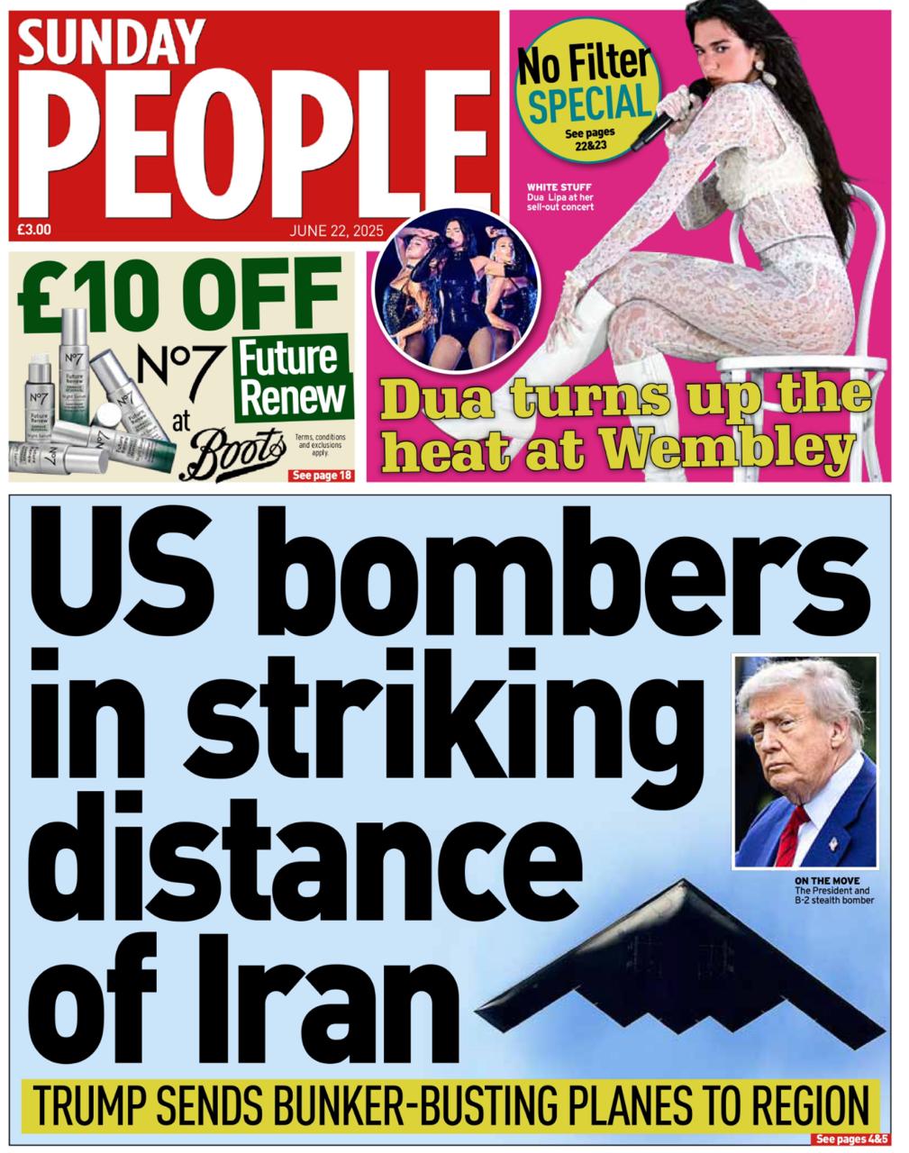 Sunday People вышла с первой полосой, предупреждающей о том, что американские бомбардировщики уже находятся на дистанции нанесения удара по Ирану.