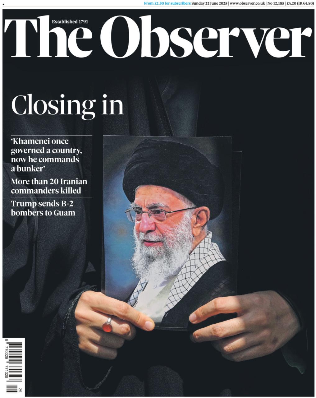 А The Observer вообще сегодня «радует» чуть ли не траурной полосой с изображением иранского аятоллы и фатальным заголовком «Приближается». Газета утверждает: «Раньше Хаменеи управлял страной, а теперь он командует бункером». Видимо, редакция ожидала, что Трамп в первую очередь ударит по бункеру аятоллы…