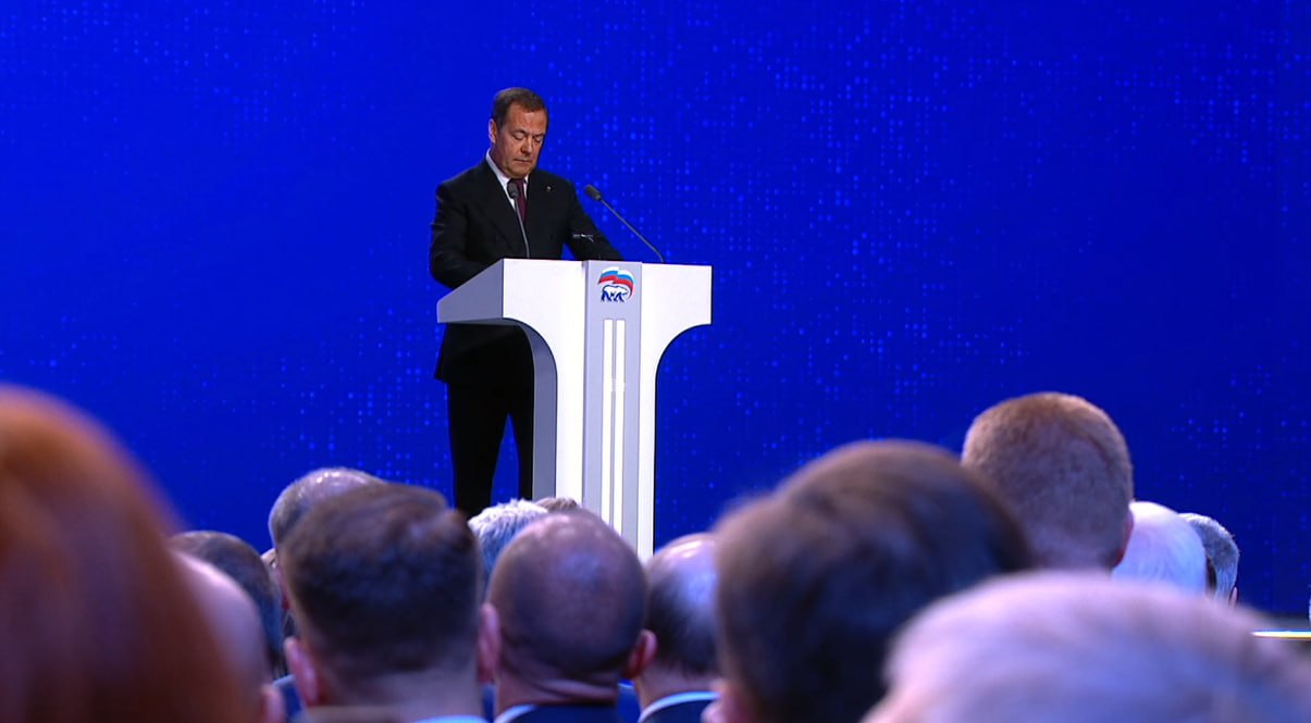 Председатель партии «Единая Россия», зампред Совбеза РФ Дмитрий Медведев взял слово на пленарном заседании: «В феврале 2022 года Россия встала на защиту нашего суверенитета и безопасности. Сегодня мы даем решительный отпор коллективному Западу с его арсеналом и мощью. В ходе СВО как и 80 лет назад в годы Великой Отечественной войны мы ведем бой с опасным и циничным врагом. Надо признаться, что наши противники плохо выучили уроки истории. В течение веков нас никто не смог подчинить своей воле. Не получится и сейчас».