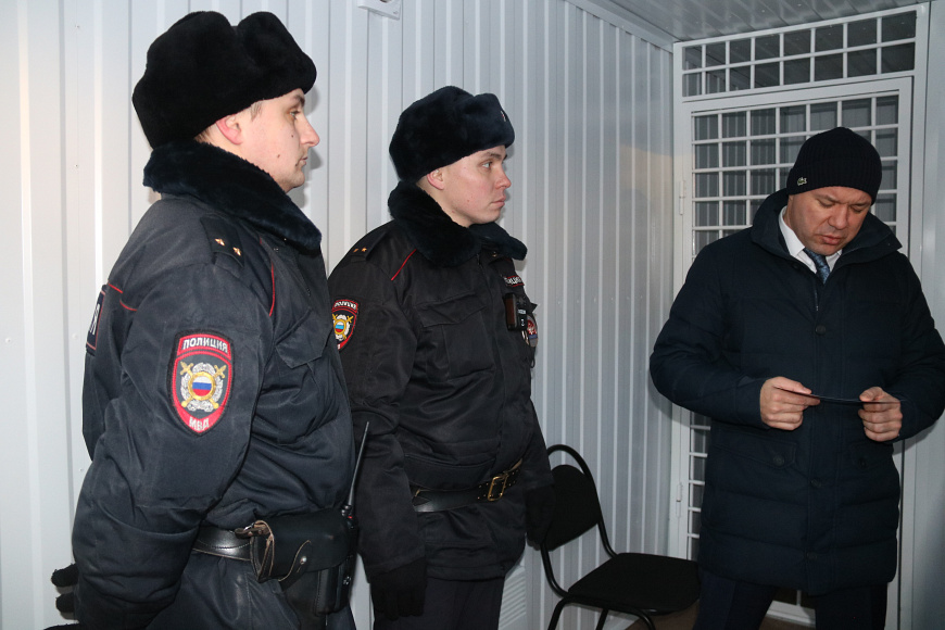 Руководители ознакомились с оснащением пункта, осмотрели место для составления административных материалов, комнату отдыха и обеденную зону для сотрудников, помещение для задержанных.