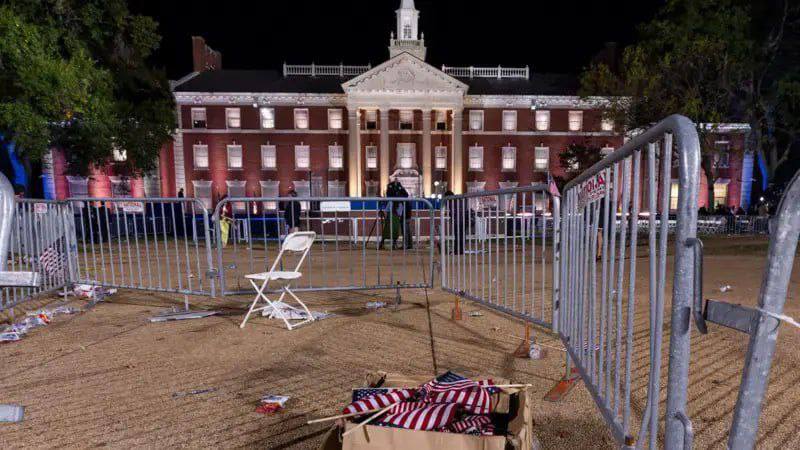 Обстановка на месте, где Камала Харрис должна была выступить с победной речью. Толпа ее сторонников разошлась, оставив после себя пустые стулья, разбросанные бутылки и флаги США.