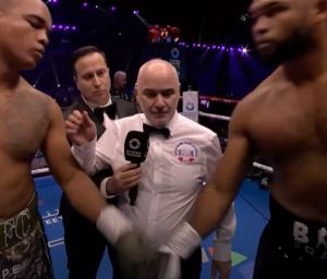 Рефери не вмешался, когда Уордли борцовским приёмом развернул соперника у канатов спиной к себе. Кларк пропустил два боковых, а затем ещё и правый хук, который стал решающим — оппонент повис на канатах.