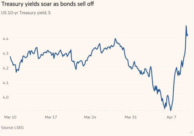 Казначейские облигации США падают вместе с акциями по всему миру после того, как президент США Дональд Трамп повысил торговые пошлины до 100-летнего максимума.