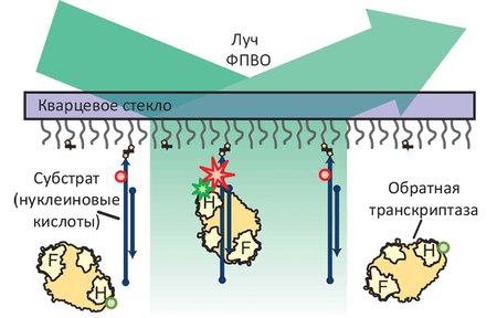 В статье Аббонданзиери [1] приведены удивительные данные о механизмах взаимодействия обратной транскриптазы с различными нуклеиновыми кислотами и их дуплексами. Для определения ориентации одиночной (!) молекулы ОТ по отношению к связанному РНК/ДНК гибриду, учёные использовали измерения резонансного переноса энергии флуоресценции (FRET) между различными молекулами-флуорофорами, которыми помечали как фермент, так и субстрат (см. картинку в заглавии). В отличие от типичных биохимических экспериментов, изучающих популяции молекул и их комплексов, спектроскопические методики вроде FRET позволяют непосредственно наблюдать за одиночными молекулярными событиями в реальном времени. Для анализа FRET две интересующие исследователей молекулы — в данном случае, обратную транскриптазу и нуклеиновую кислоту, — помечают флуоресцирующими химическими группами, миграция флуоресцентной энергии между которыми зависит от расстояния и может использоваться для оценки межмолекулярных взаимодействий.