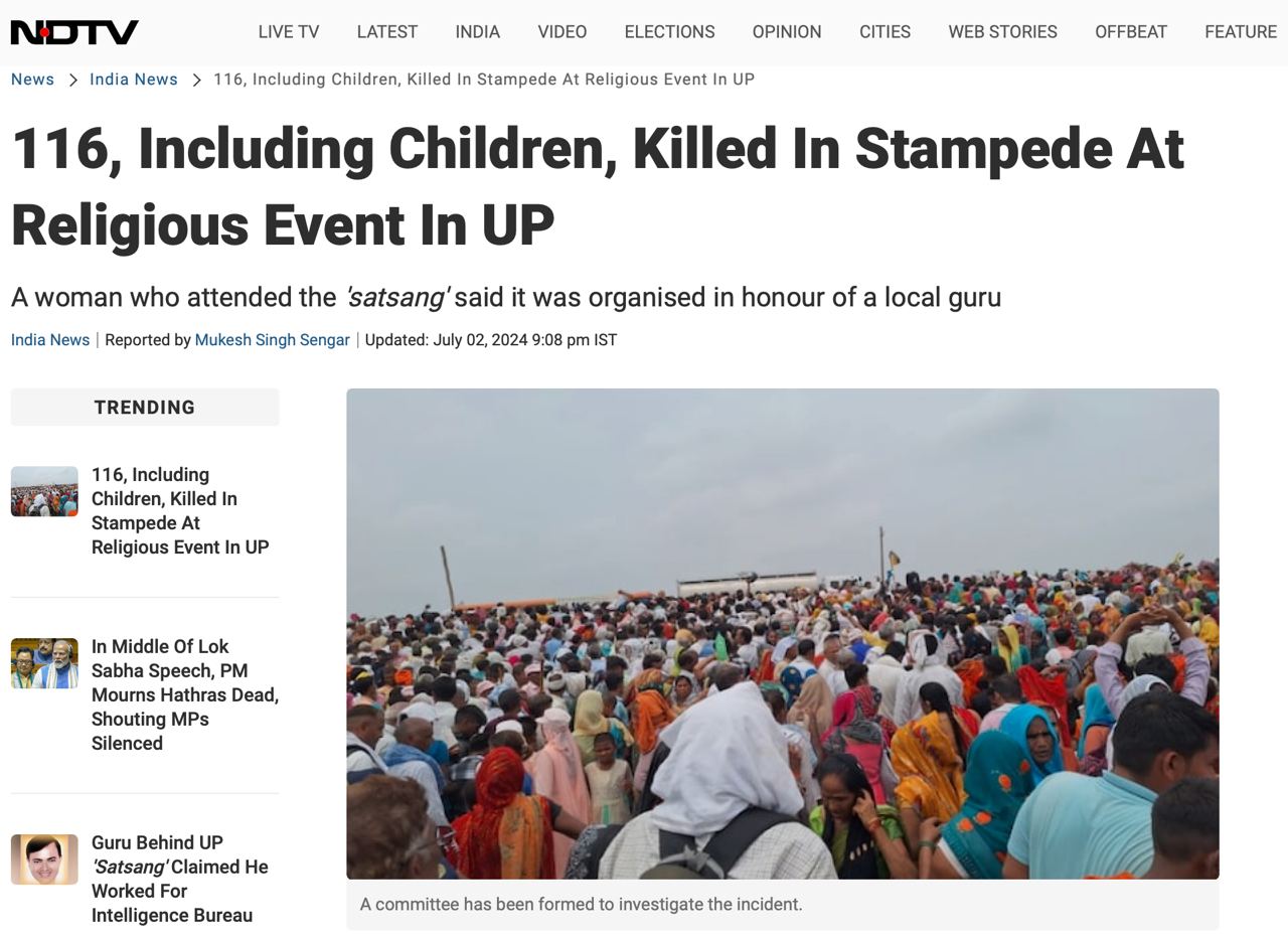 NDTV отмечает, что людей «не отпускали до тех пор, пока машина самозваного гуру не уехала», из-за чего толпа скопилась на небольшом пространстве и началась паника.