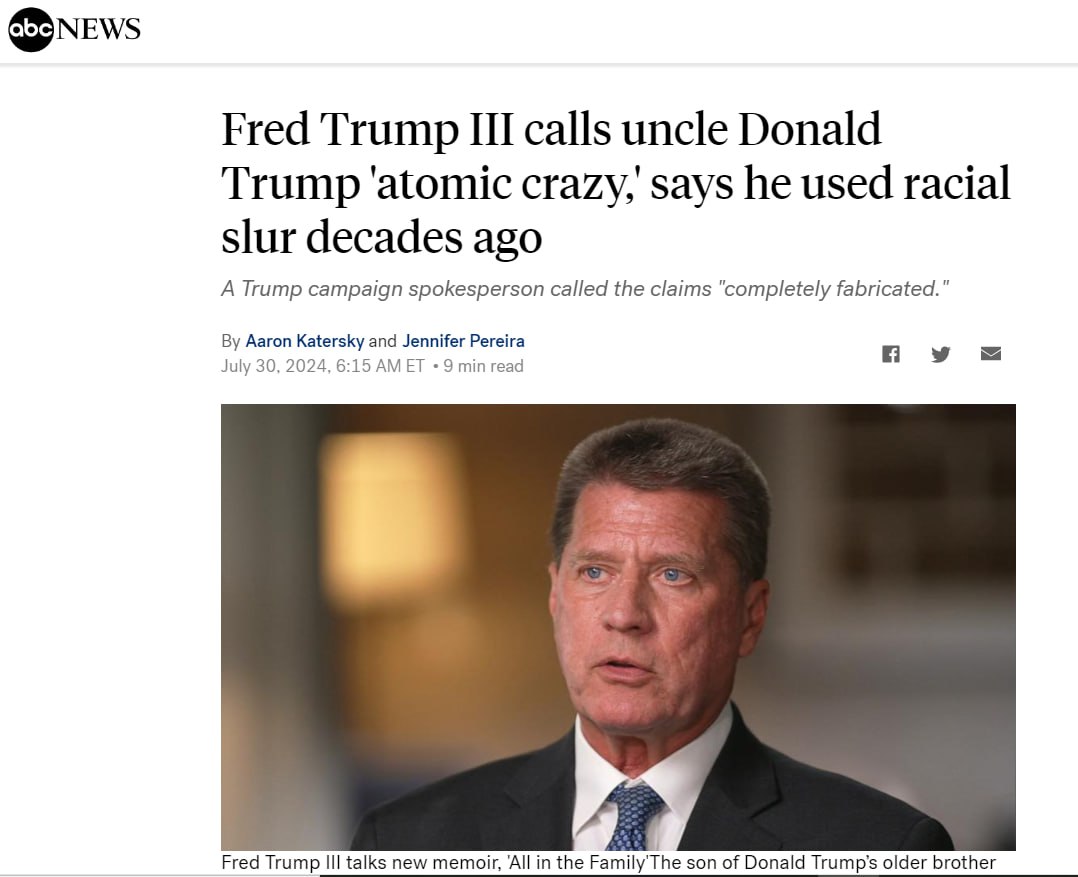 Племянник Трампа назвал его «абсолютно сумасшедшим» и поддержал Харрис, — ABC News