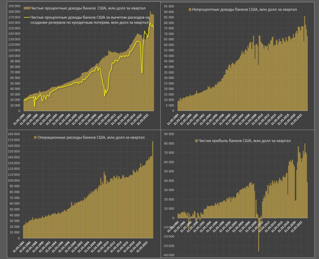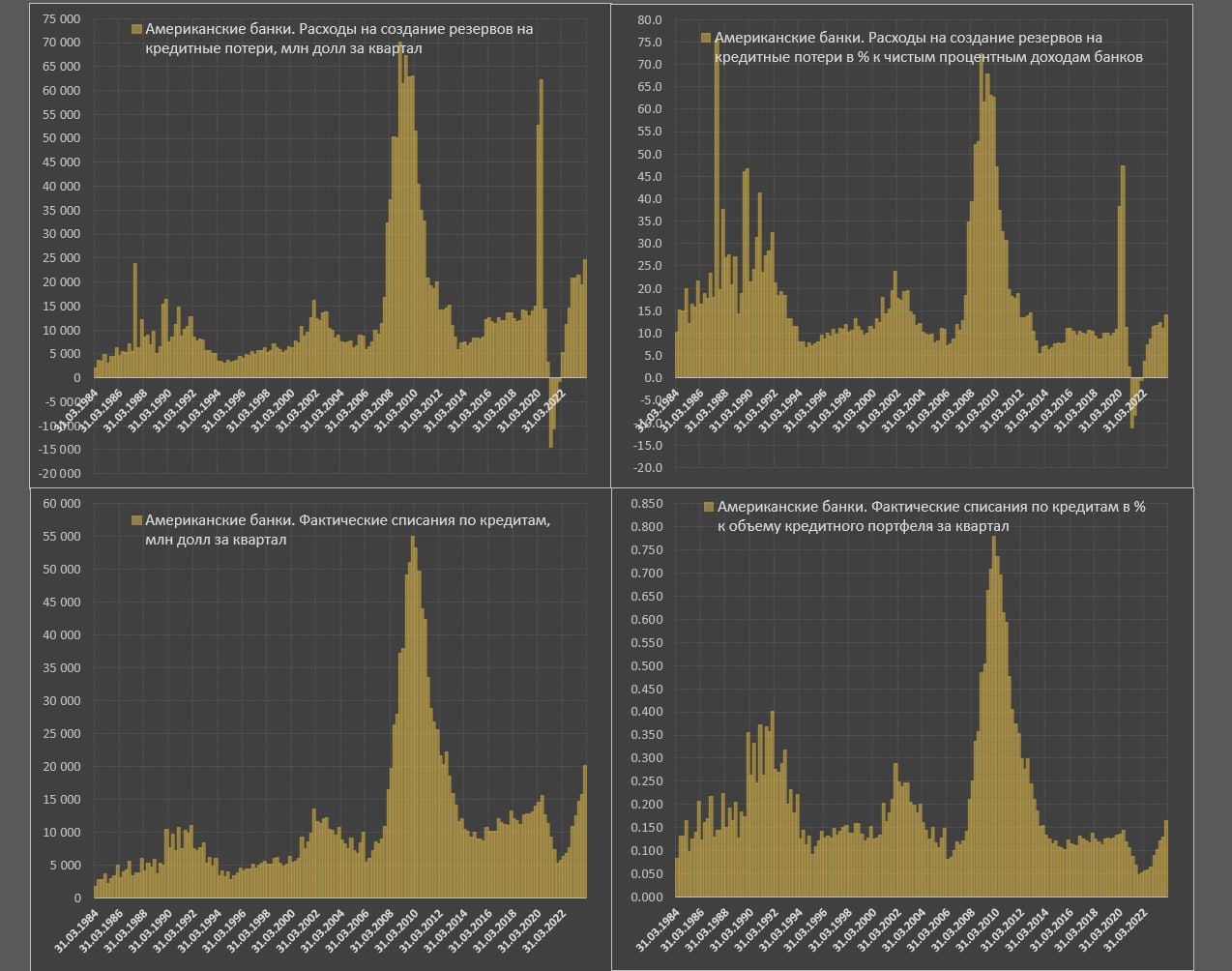 Расходы на создание резервов по кредитным потерям выросли до 24.7 млрд в 4кв23, что почти вдвое больше (13 млрд), чем было в среднем за квартал в 2017-2019. Без учета панического резервирования в 2020, последний раз подобные расходы были в конце 2010.
