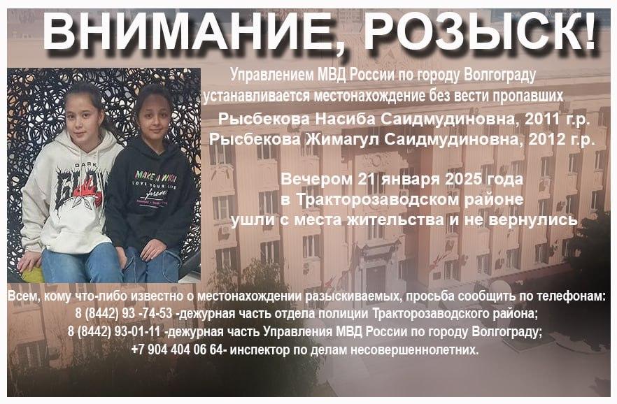 Полиция Волгограда ищет двух без вести пропавших сестер — Насибу и Жимагул Рысбековых. Обе девочки вечером 21 января ушли из дома и до настоящего времени не вернулись.