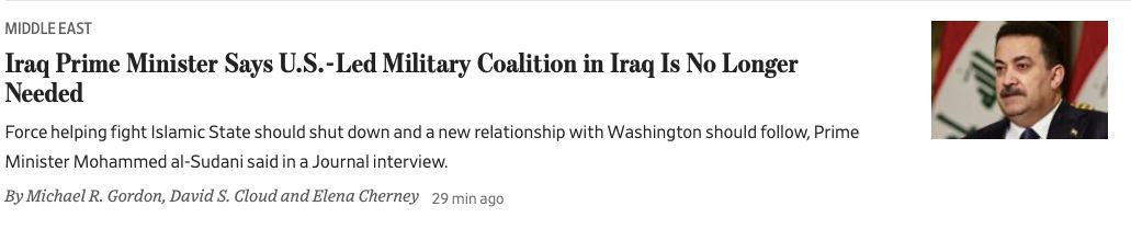 🇮🇶✖️🇺🇸Премьер-министр Ирака говорит, что нам больше не нужно присутствие международной коалиции во главе с Соединенными Штатами в Ираке – The Wall Street Journal