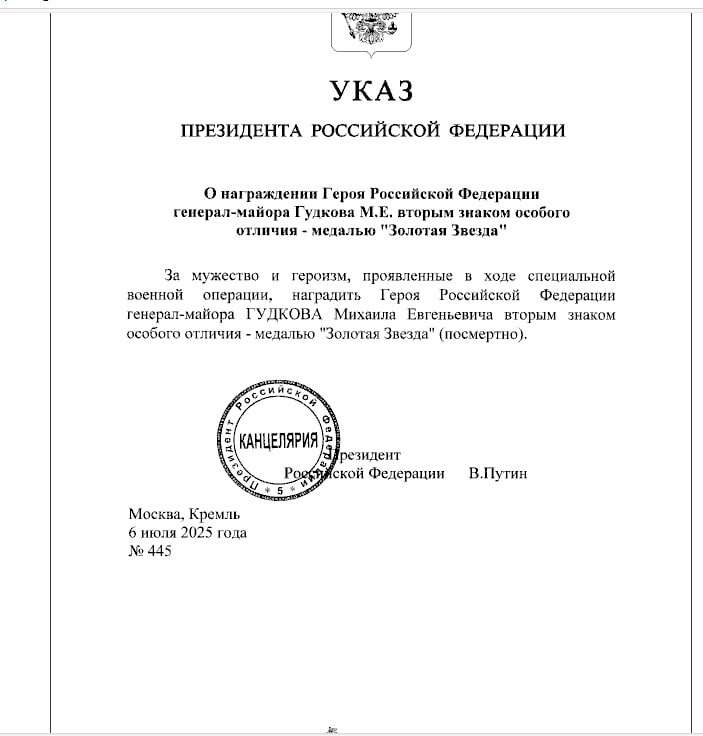 Владимир Путин посмертно наградил заместителя главнокомандующего ВМФ Михаила Гудкова медалью «Золотая Звезда»