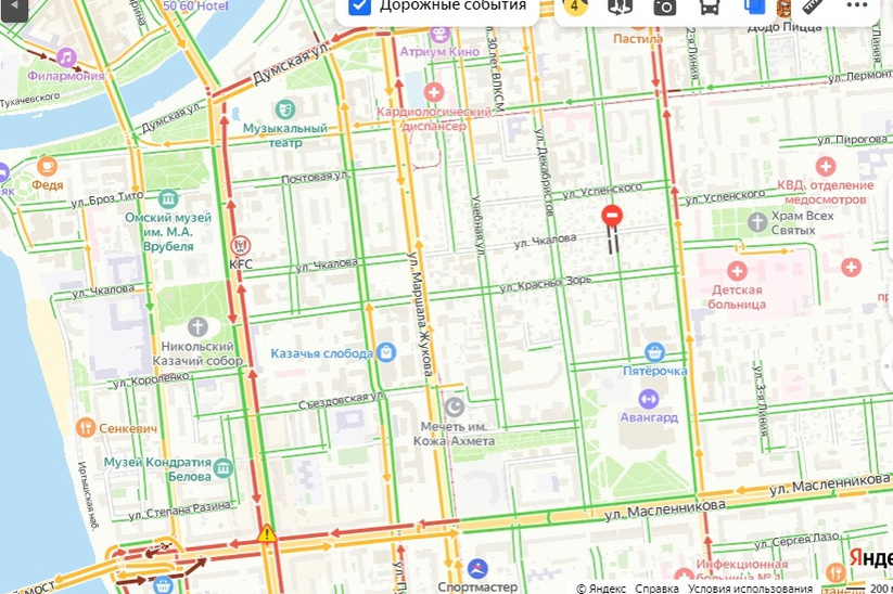 По данным сервиса «Яндекс.Пробки», на данный момент в Омске также затруднено движение по Ленинградскому мосту, улице Фрунзе и на участке улицы Герцена от торгового центра «Омский» до Октябрьской улицы.