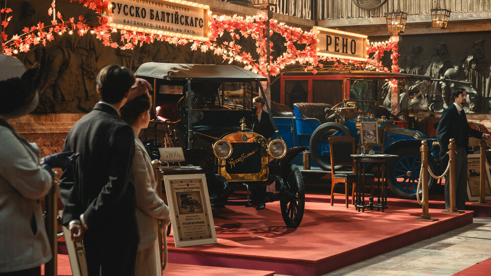 В апреле мы попали на площадку фильма в Санкт-Петербурге. В Этнографическом музее снимали выставку автомобилей. Помимо «Руссо-Балта», свои модели показывали именитые зарубежные компании: «Роллсъ-Ройсъ», «Чалмерсъ», «Бенцъ и Ко» и другие. По сюжету посетители выставки обращают внимание, что «Руссо-Балт» дороже конкурентов, а тут в зале появляется главный гость — император Николай II (Сергей Волков). Густав Лист (Лазаров) хочет отвлечь его от российского автомобиля и показывает новый гоночный Blitzen Benz. Чтобы заинтересовать императора, Нагель (Янковский) анонсирует сборку нового гоночного автомобиля, несмотря на удивление его команды.