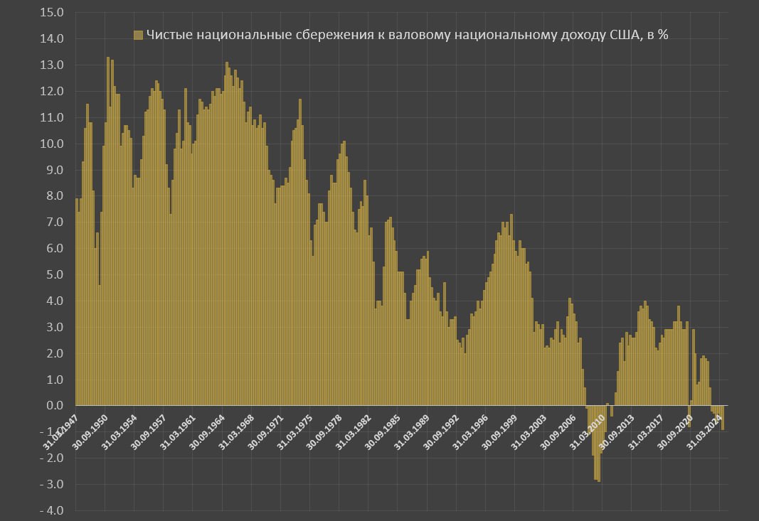 С 2023 по 2кв24 чистые сбережения США составляют минус 0.5% из-за исчерпания сбережения частного сектора на фоне роста дефицита бюджета.