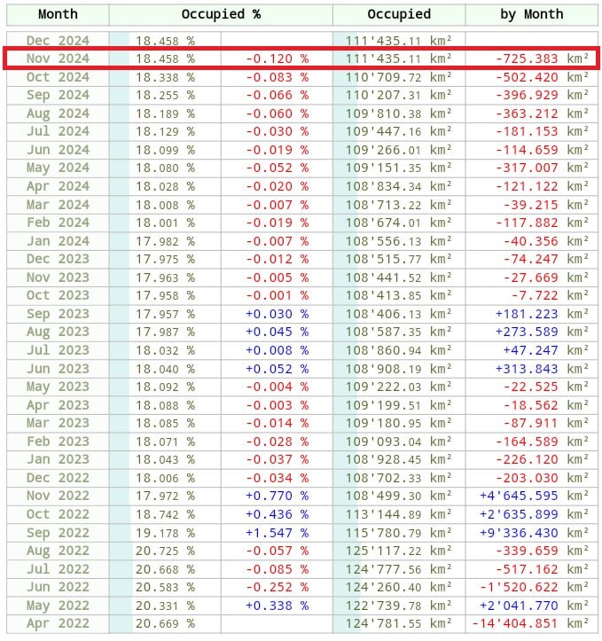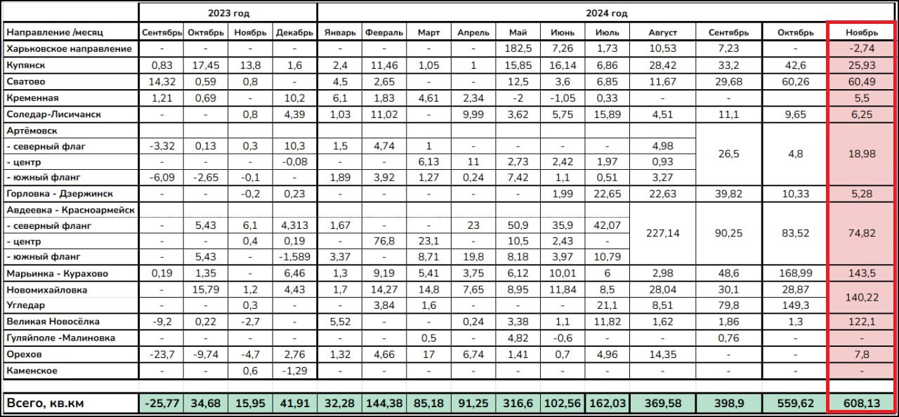 По одним оценкам зона контролируемая армией России в ноябре 2024 выросла на 608,13 км², с темпом продвижения 20,27 км² в среднем за сутки. По западным оценкам общая цифра за ноябрь составляет 725 км².