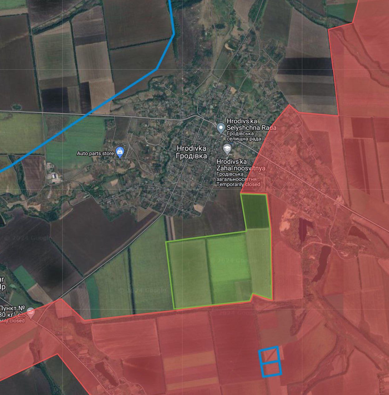 Также сообщается, что Армия России продвинулась по Покровскому фронту и вышла на штурмуемую Гродовку (население до начала военных действий ~ 3 тысяч человек) с юга.