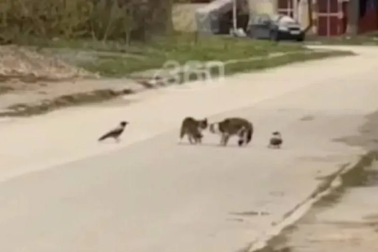 Две птицы, активно принимающие участие в кошачьей потасовке, то ли пытались подбодрить оппонентов, то ли разнять их. Один из воронов даже ущипнул и словно попытался оттащить одного из драчунов, однако коты не обращали внимания на пернатых подстрекателей. Кто выиграл дуэль и чем закончилось состязание, осталось за кадром.