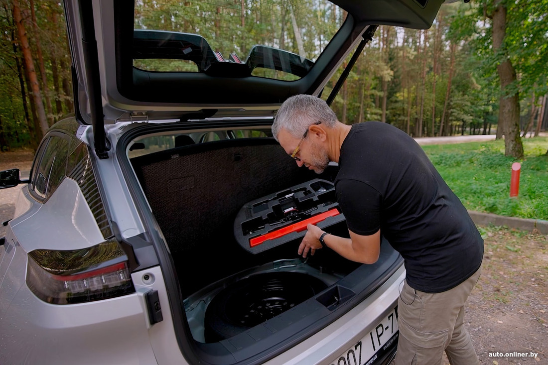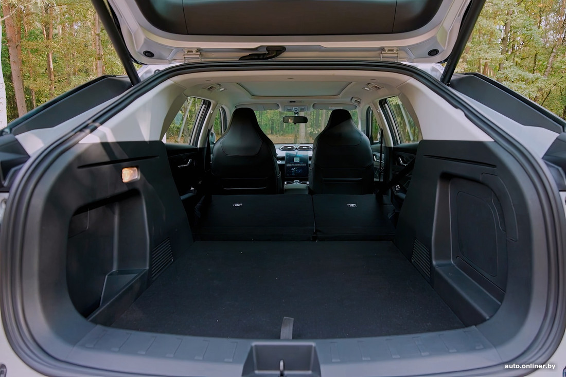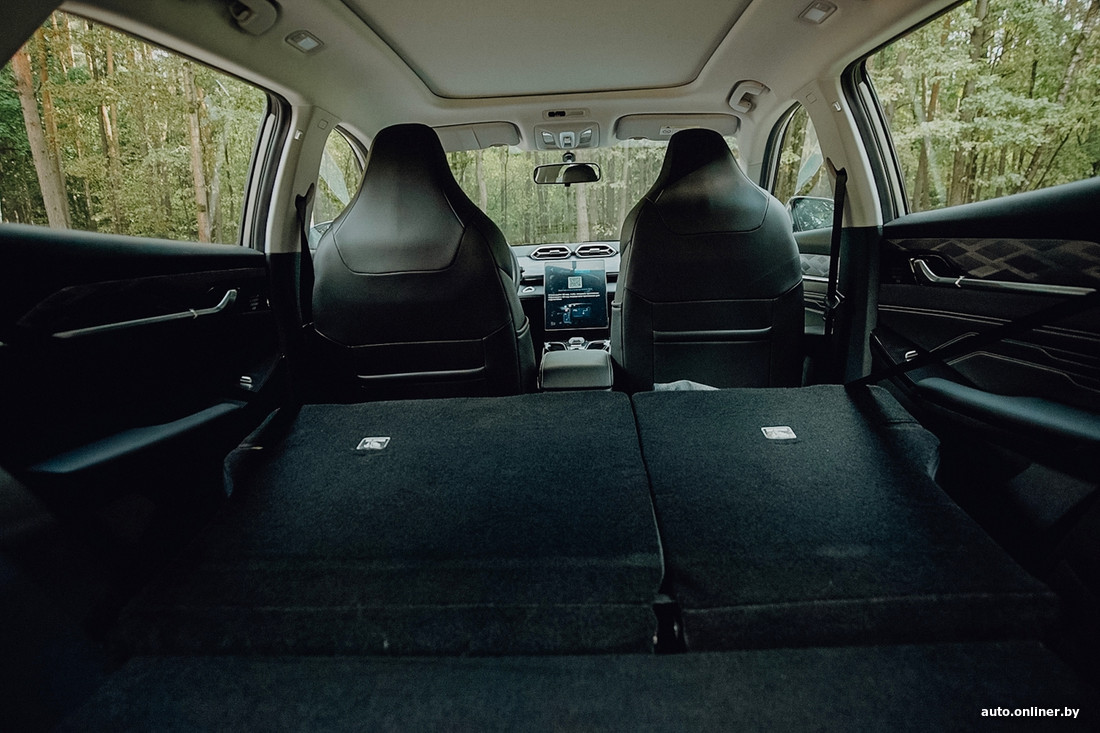 И это видно по багажному отделению: у бензиновой версии заявленный объем составляет 637 литров. Визуально и не скажешь, что там столько «до полки», тем более что и полки здесь никакой нет. Может быть, китайцы грузили до крыши? Или же в эту цифру включено и просторное подполье, в котором хватило бы места и для полноразмерного колеса? Но там всего лишь докатка с толстенным вкладышем для штатного инструмента. При складывании спинки дивана можно получить не только ступеньку и большой угол наклона относительно пола, но и до 1683 литров. Заметим, что у гибридной версии с небольшим (всего 1,8 кВт·ч) аккумулятором багажник чуть поменьше — 555/1567 литров соответственно.