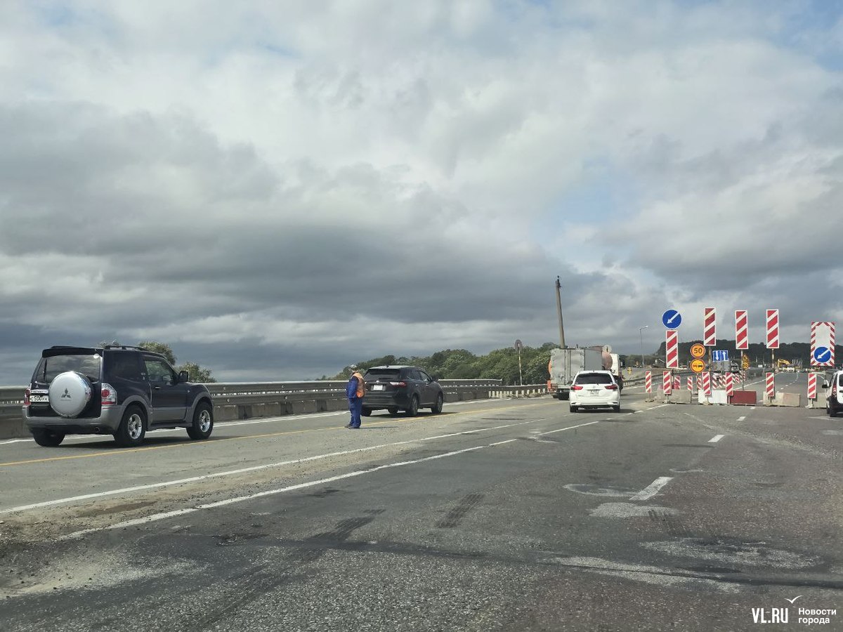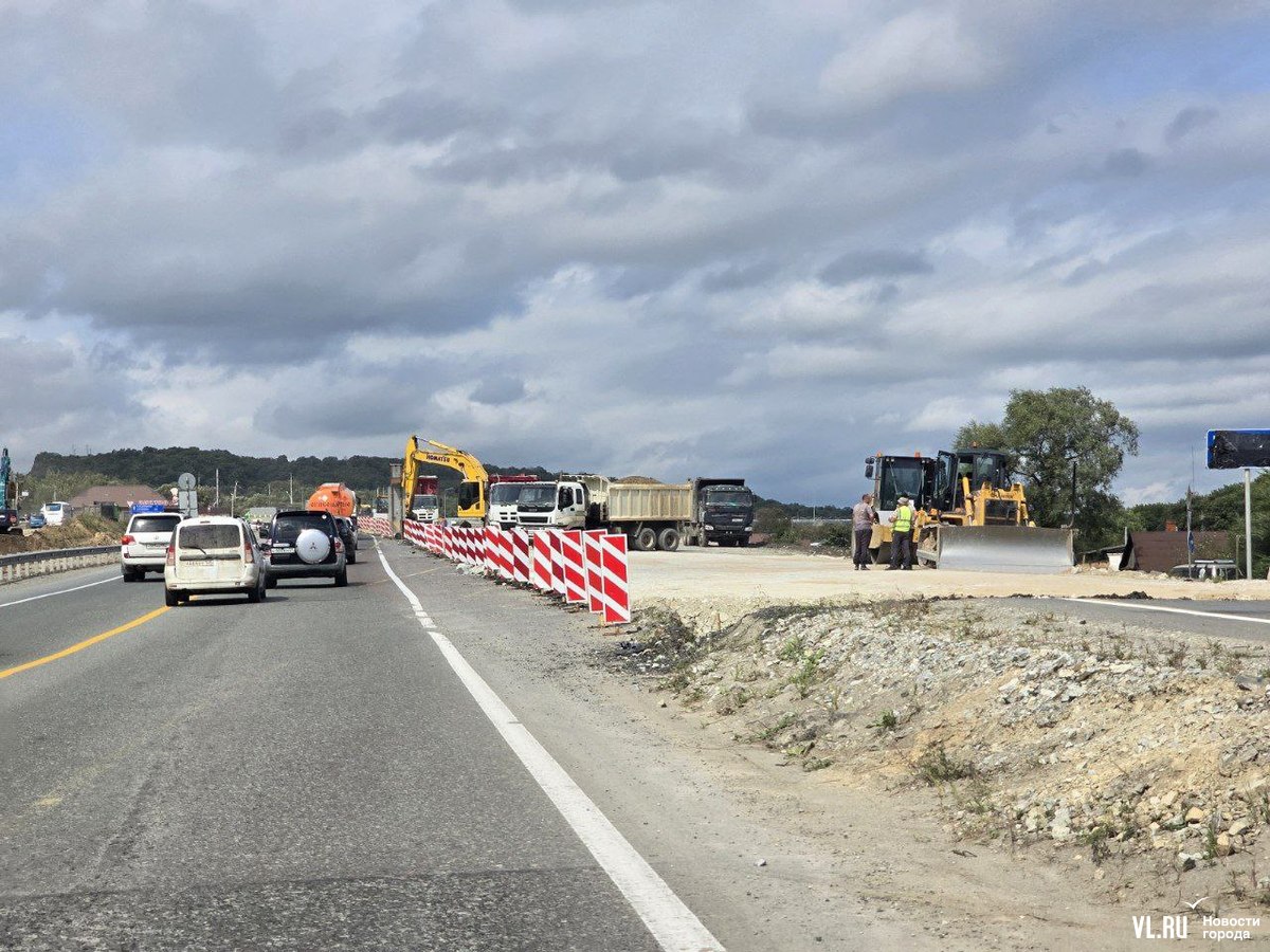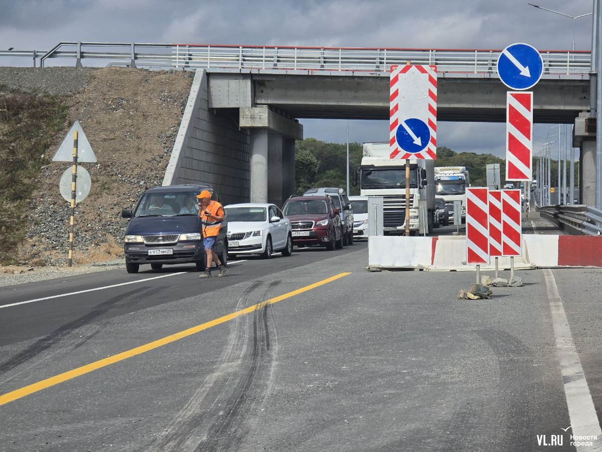 Днём дорожники перекрывали две полосы в районе новой развязки на Раздольное для ремонта. Для проезда осталось две полосы по направлению во Владивосток. На участке ввели реверсивное движение, рабочие периодически останавливают то один, то другой поток.