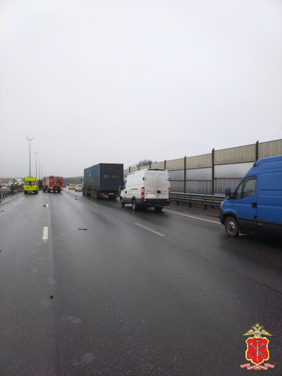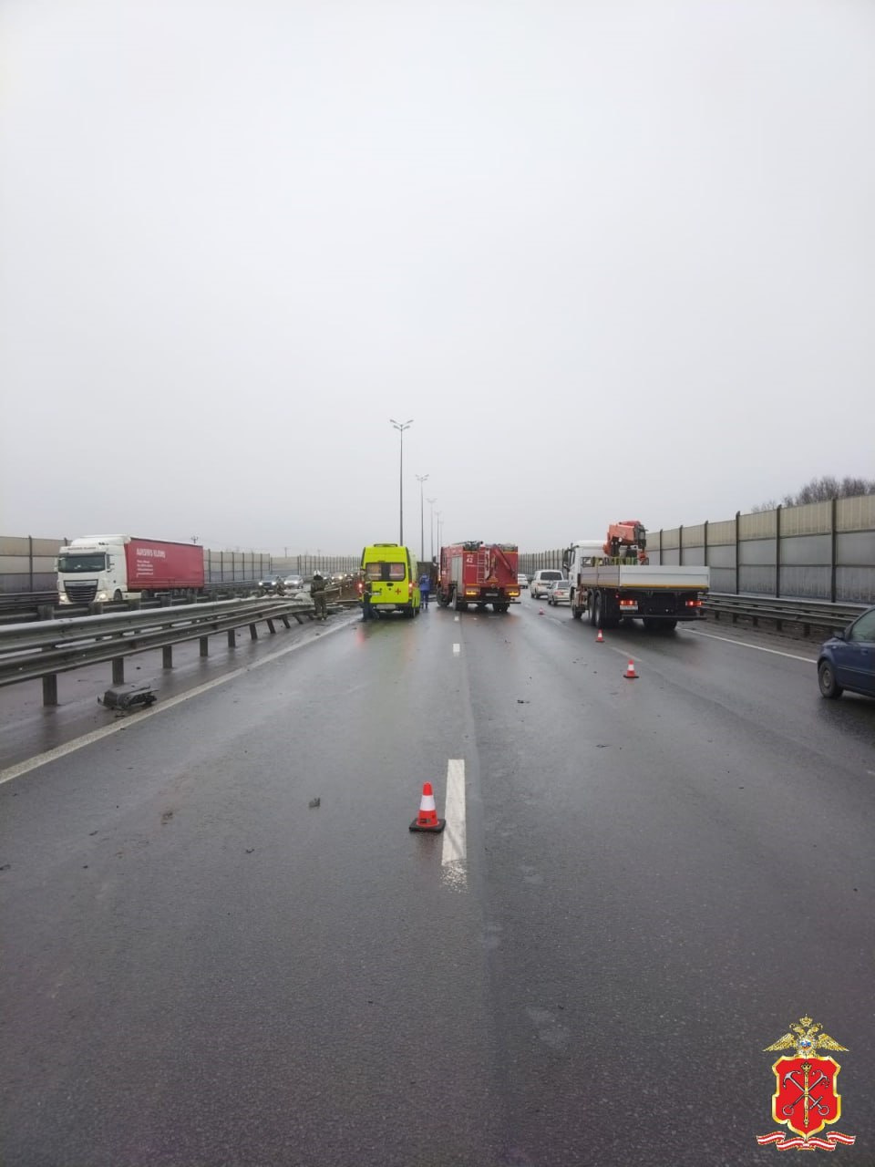 Петербургская полиция показывает фотографии смертельной аварии на обходе Гатчины. Погибшему водителю, по данным ГУ МВД по Санкт-Петербургу и Ленинградской области, было 50 лет.