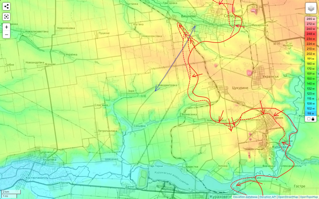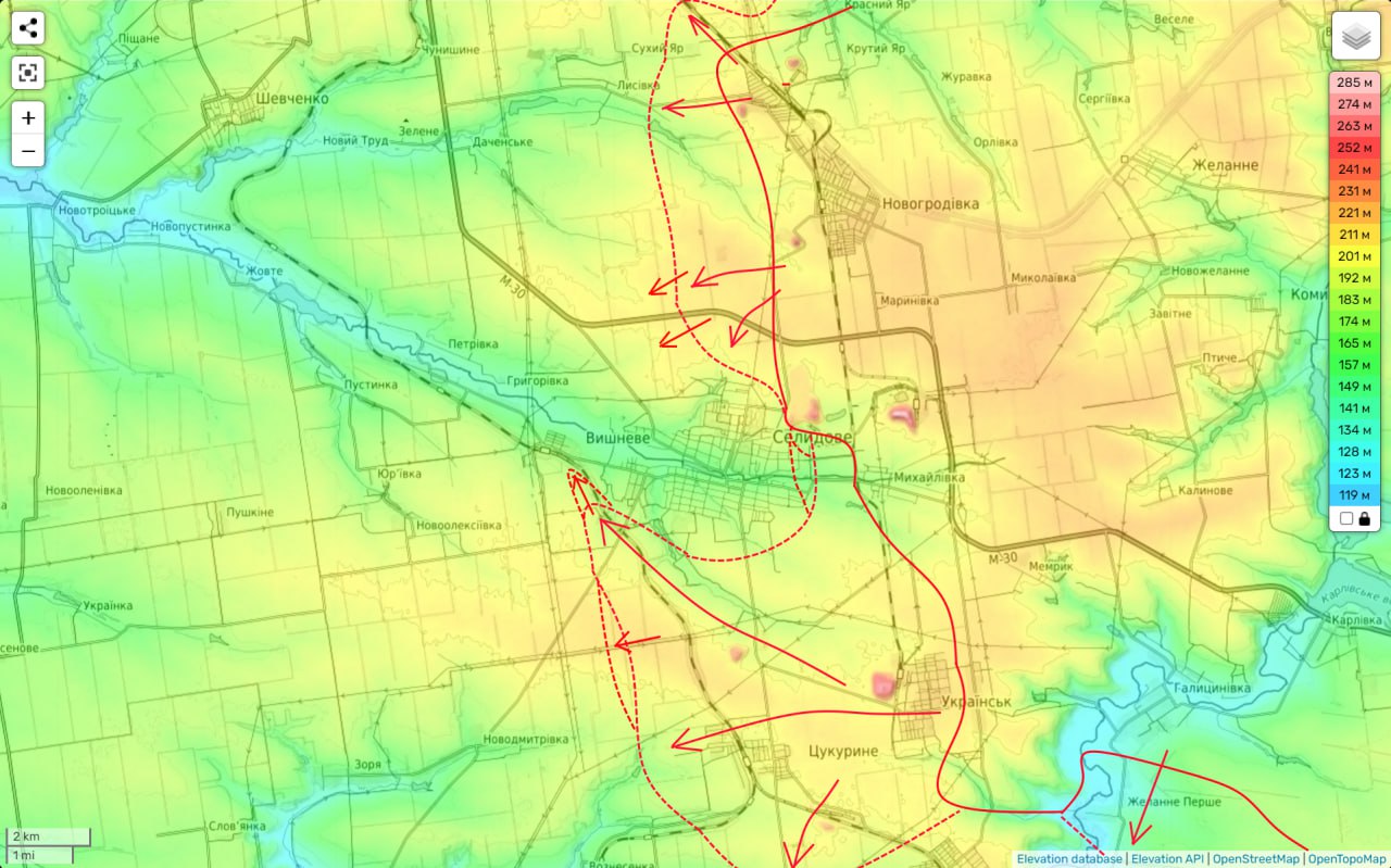 Штурм Селидово. Здесь наши штурмовики зашли на восточные улицы города и там закрепились. Также был достигнут успех на южном охвате города. Наши штурмовики сумели зайти в крайние дома н.п. Вишневое (со стороны железной дороги) и там закрепились.