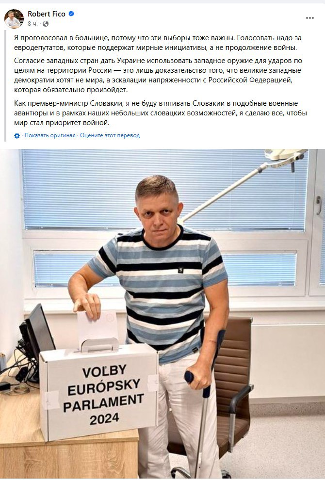 Восстанавливающийся после тяжелых ранений и последующих операций премьер-министр Словакии Роберт Фицо голосует на выборах. Фицо в очередной раз обвинил Запад в разжигании войны и призвал голосовать за тех депутатов, которые выступают против войны.