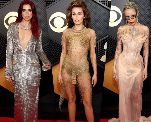 На церемонии Майли сменила сразу пять нарядов: на ковровой дорожке премии певица появилась в образе Maison Margiela и туфлях Christian Louboutin, для получения награды исполнительница переоделась в платье Tom Ford, а затем в черный костюм. Для исполнения грэмминосной песни Flowers Сайрус выбрала сверкающий топ и юбку, а финальным аккордом смен образов стало кружевное боди.