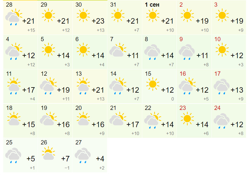 Gismeteo предупреждает о дождях со второй половины месяца. Самым теплым днем станет 1 сентября, днем воздух прогреется до +21 градуса, ночью ожидается до +10 градусов. Затем на протяжении всего месяца температура будет опускаться. Самым холодным днем станет 27 сентября, днем ожидается до +4, ночью до +2. Первые минусовые температуры придут в город 26 сентября, днем воздух прогреется до +7 градусов, ночью столбик термометра опустится до -1 градуса.