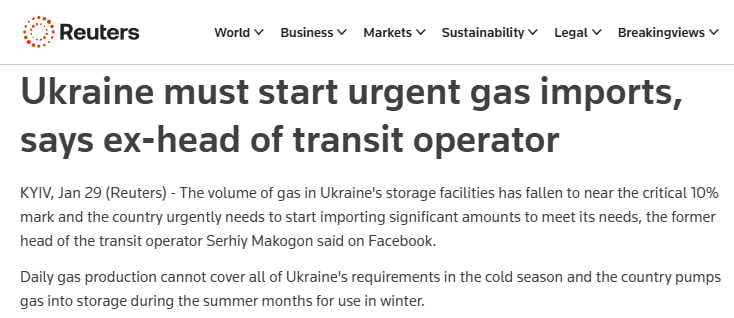 «Объём газа в хранилищах Украины упал почти до критической отметки в 10%», – цитирует издание экс-главу компании «Оператор ГТС Украины» Сергея Макогона.