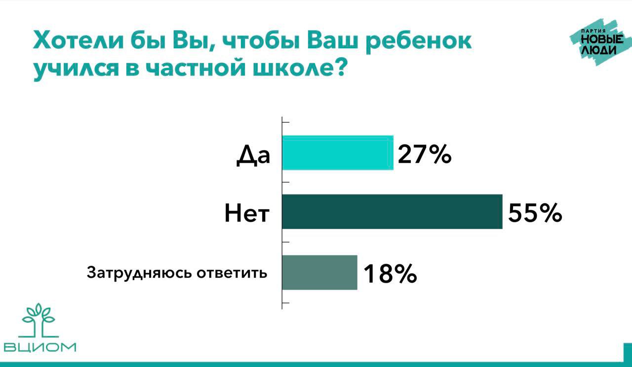 27% родителей хотели бы, чтобы их ребёнок учился в частной школе. Это результаты опроса, который по нашему заказу провёл в декабре ВЦИОМ. Но сегодня в частных школах учится только 1% детей.