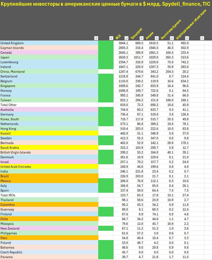 По последней отсечке в мар.25 нерезиденты владели американскими ценными бумагами на 31.23 трлн, где трежерис – 7.57 трлн, акции – 17.65 трлн, ипотечные облигации и бумаги агентств – 1.34 трлн, корпоративные облигации – 4.67 трлн по собственным расчетам на основе данных TIC.