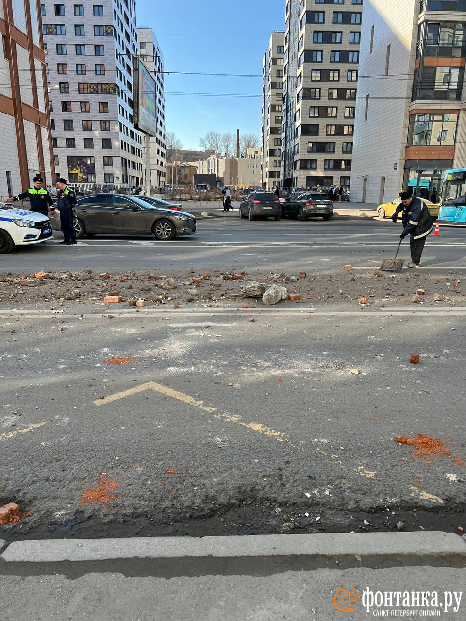 Дорога перед автобусной остановкой оказалась усыпана обломками кирпичей и землей. Баррикады были и на пешеходном переходе, но, судя по фото, прибывшие сотрудники убрали их в первую очередь.