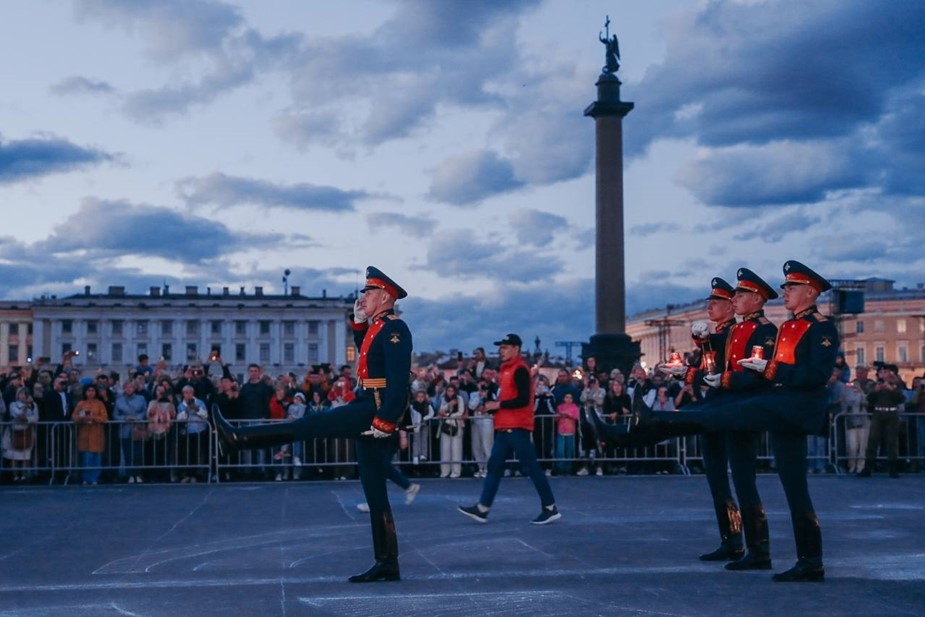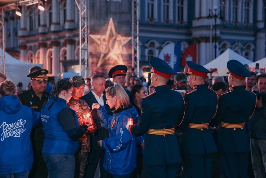"Волонтёры Победы" во время участия в акции "Свеча памяти" на Дворцовой площади в Петербурге, июнь 2024 года.
