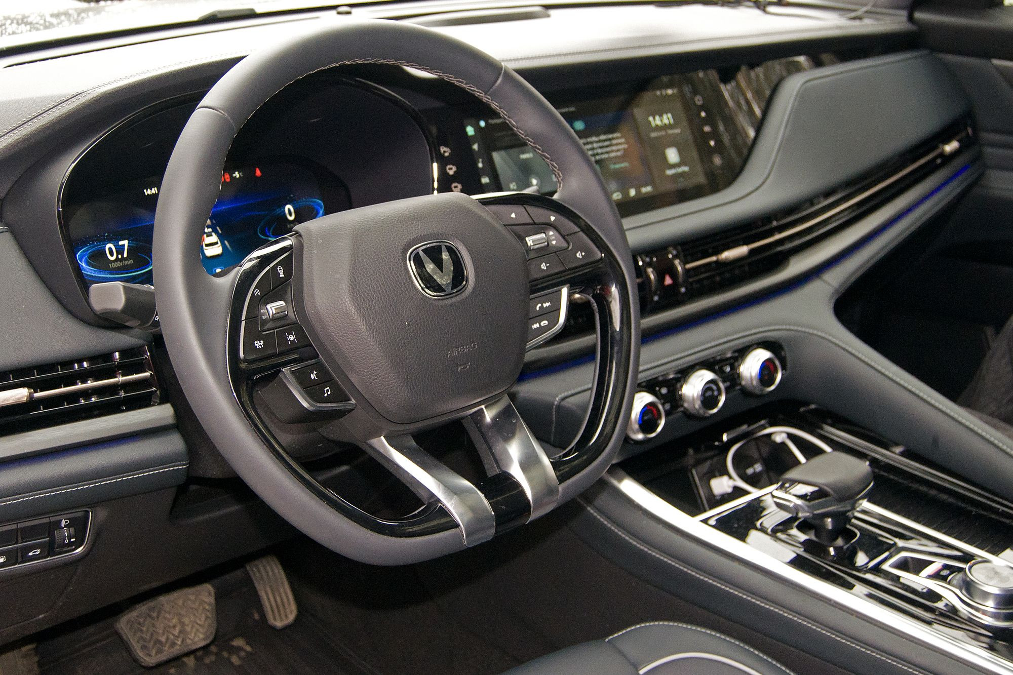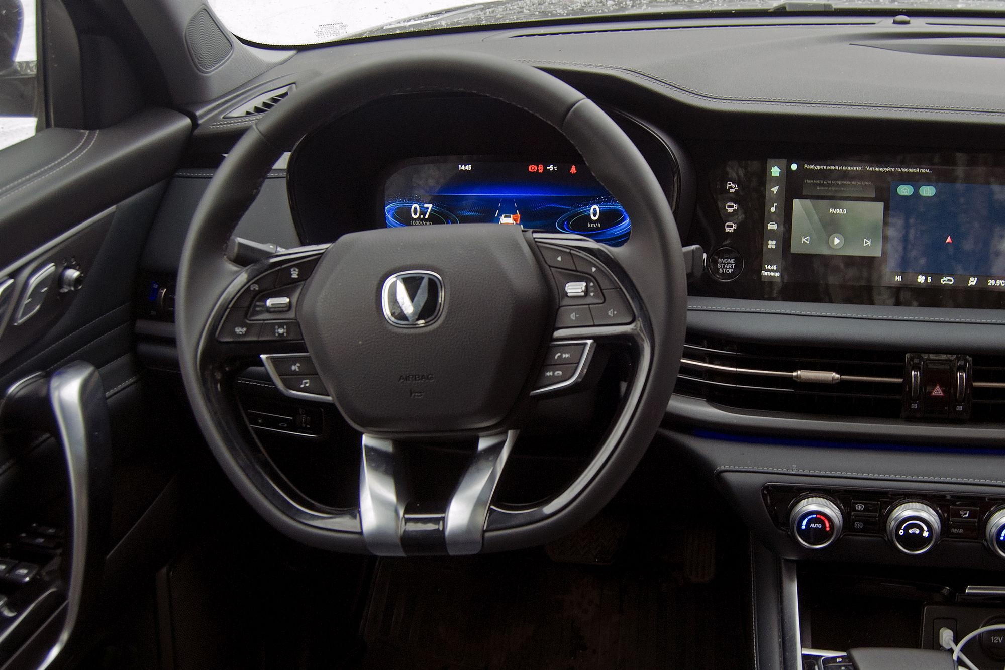 Если во многих китайских автомобилях зачастую первыми приковывают внимание несуразно огромные экраны мультимедийной системы и цифровой приборной панели, то в CS95 New они выглядят естественно и уместно. Их тут тоже два: 12,3-дюймовый дисплей управления мультимедийным развлекательным центром и 10,25-дюймовый дисплей приборной панели. Графика очень качественная, быстродействие тоже на высоте. И опять же нужно отметить чувство меры дизайнеров: ничего кричащего нет, всё выглядит умеренно благородно, и даже спортивная тема оформления приборки не режет глаза. Всего тем три, и все они по-своему хороши. Единственное, к чему можно придраться, это не самые крупные шрифты: иногда приходилось долго искать взглядом нужные символы и надписи.