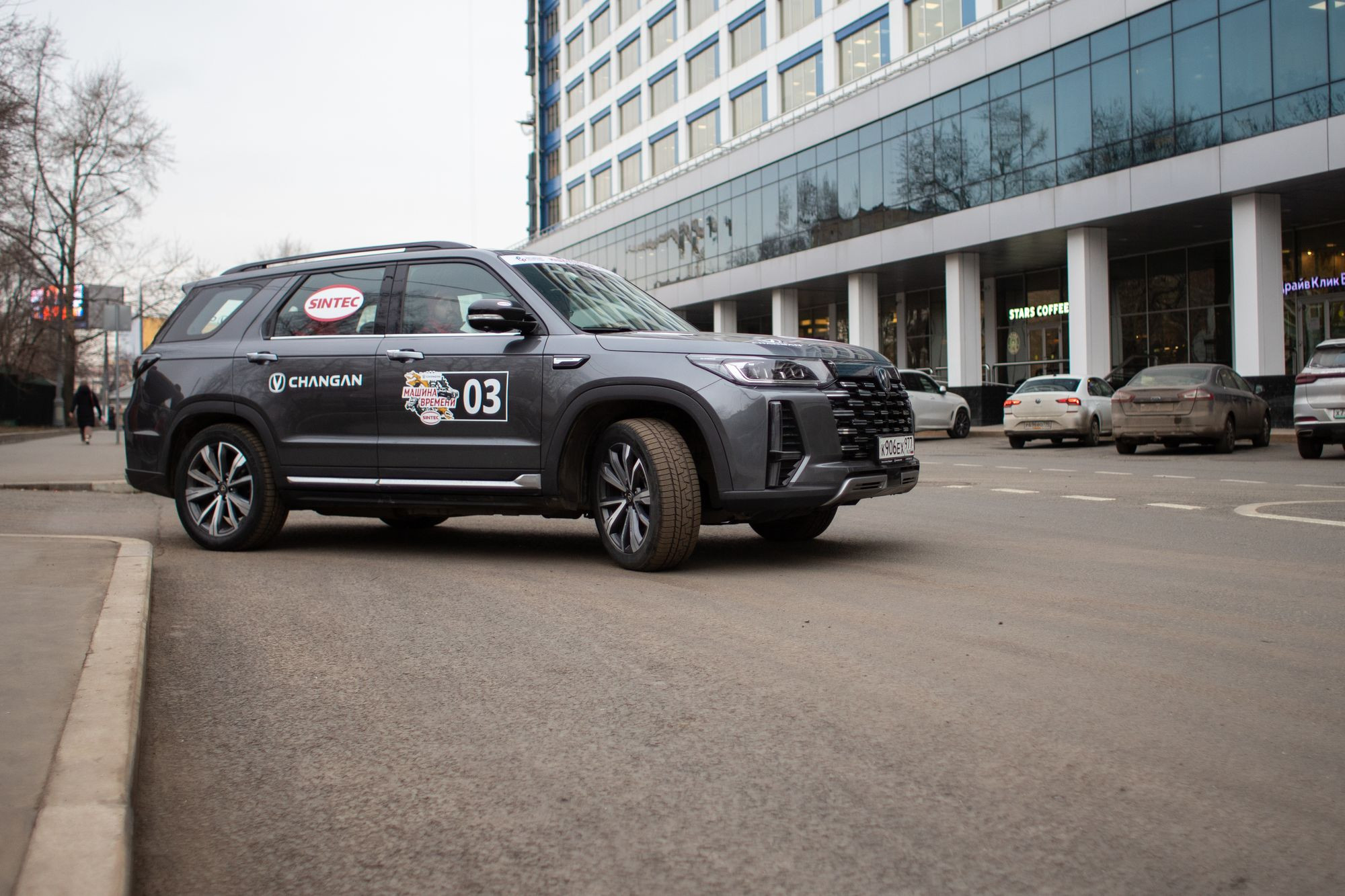 Среди заявленных в пробеге автомобилей оказались и CS95 New, так что отказываться было грех. К тому же безнаказанно приложить где-то в ралли-рейде серийный Changan и не получить за это нагоняй от представительства бренда – дело святое, этой возможностью надо воспользоваться в обязательном порядке. В пресс-туре такого формата мы никогда не участвовали (потому что их никто не проводил), поэтому ваш покорный слуга заранее закрепил за собой интересующую машину, собрал чемодан и улетел в Москву на старт этого пробега. Опустим пресс-конференцию в офисе «Российской газеты» и прочие предстартовые ласки – нас в первую очередь интересует CS95 New, с которым мы и начнём знакомиться на парковке, откуда восемь экипажей отправятся укатывать в соревнованиях кроссоверы и пикапы Changan.